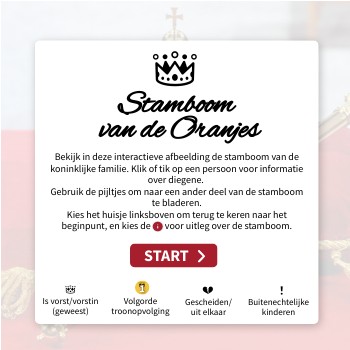 Bekijk in deze interactieve afbeelding de stamboom van de koninklijke familie. Klik of tik op een persoon voor informatie over diegene. Gebruik de pijltjes om naar een ander deel van de stamboom te bladeren. Kies het huisje linksboven om terug te keren naar het beginpunt, en kies de voor uitleg over de stamboom.