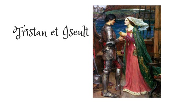c) Comme le soleil brûlait et qu’ils avaient soif, ils demandèrent à boire. L’enfant chercha quelque breuvage, tant qu’elle découvrit le coutret confié à Brangien par la mère d’Iseut. « J’ai trouvé du vin ! » leur cria-t-elle. Non, ce n’était pas du vin : c’était la passion, c’était l’âpre joie et l’angoisse sans fin, et la mort. L’enfant remplit un hanap et le présenta à sa maîtresse. Elle but à longs traits, puis le tendit à Tristan, qui le vida. À cet instant, Brangien entra et les vit qui se regardaient en silence, comme égarés et comme ravis. Elle vit devant eux le vase presque vide et le hanap. Elle prit le vase, courut à la poupe, le lança dans les vagues et gémit :« Malheureuse ! maudit soit le jour où je suis née et maudit le jour où je suis montée sur cette nef ! Iseut, amie, et vous, Tristan, c’est votre mort que vous avez bue ! »
