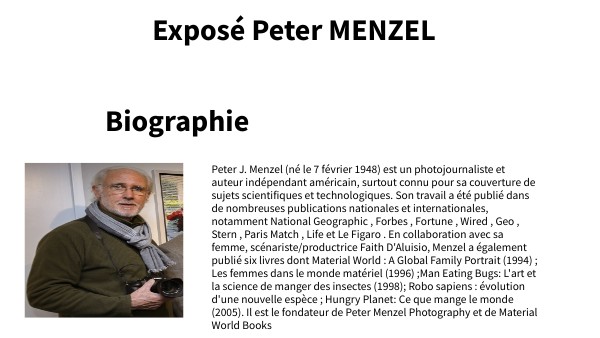 Peter J. Menzel (né le 7 février 1948) est un photojournaliste et auteur indépendant américain, surtout connu pour sa couverture de sujets scientifiques et technologiques. Son travail a été publié dans de nombreuses publications nationales et internationales, notamment National Geographic , Forbes , Fortune , Wired , Geo , Stern , Paris Match , Life et Le Figaro . En collaboration avec sa femme, scénariste/productrice Faith D'Aluisio, Menzel a également publié six livres dont Material World : A Global Family Portrait (1994) ; Les femmes dans le monde matériel (1996) ;Man Eating Bugs: L'art et la science de manger des insectes (1998); Robo sapiens : évolution d'une nouvelle espèce ; Hungry Planet: Ce que mange le monde (2005). Il est le fondateur de Peter Menzel Photography et de Material World Books