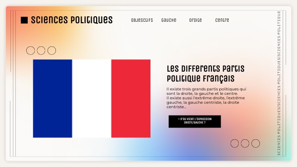 Il existe trois grands partis politiques qui sont la droite, la gauche et le centre. Il existe aussi l'extrême droite, l'extrême gauche, la gauche centriste, la droite centriste...