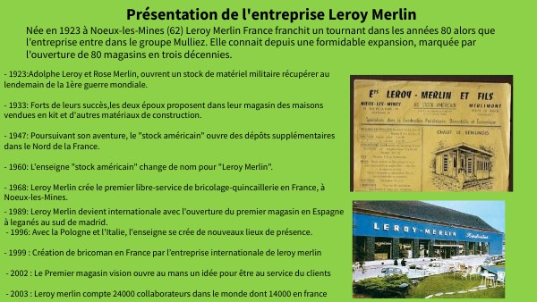 - 1923:Adolphe Leroy et Rose Merlin, ouvrent un stock de matériel militaire récupérer au lendemain de la 1ère guerre mondiale. - 1933: Forts de leurs succès,les deux époux proposent dans leur magasin des maisons vendues en kit et d'autres matériaux de construction. - 1947: Poursuivant son aventure, le "stock américain" ouvre des dépôts supplémentaires dans le Nord de la France. - 1960: L'enseigne "stock américain" change de nom pour "Leroy Merlin". - 1968: Leroy Merlin crée le premier libre-service de bricolage-quincaillerie en France, à Noeux-les-Mines.