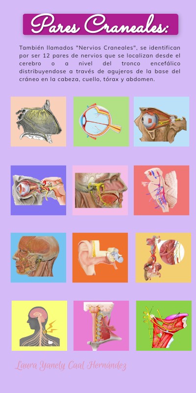 También llamados "Nervios Craneales", se identifican por ser 12 pares de nervios que se localizan desde el cerebro o a nivel del tronco encefálico distribuyendose a través de agujeros de la base del cráneo en la cabeza, cuello, tórax y abdomen.