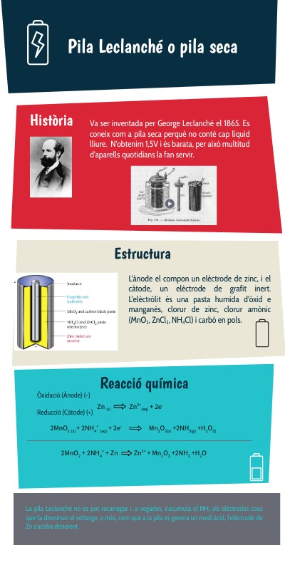 Va ser inventada per George Leclanché el 1865. Es coneix com a pila seca perquè no conté cap líquid lliure. N'obtenim 1,5V i és barata, per això multitud d'aparells quotidians la fan servir.