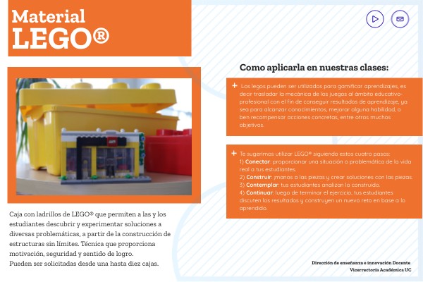Te sugerimos utilizar LEGO® siguiendo estos cuatro pasos:1) Conectar: proporcionar una situación o problemática de la vida real a tus estudiantes. 2) Construir: ¡manos a las piezas y crear soluciones con las piezas. 3) Contemplar: tus estudiantes analizan lo construido. 4) Continuar: luego de terminar el ejercicio, tus estudiantes discuten los resultados y construyen un nuevo reto en base a lo aprendido.