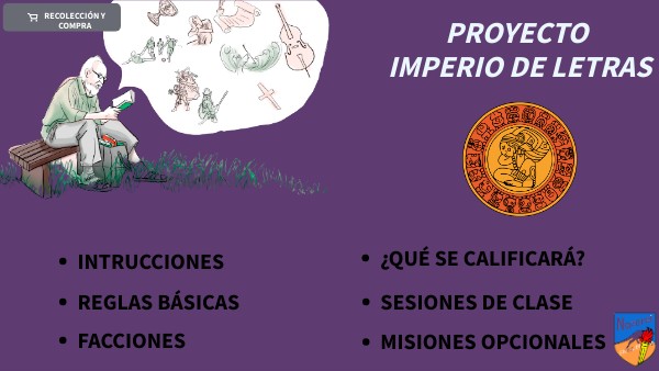 1. El trabajo será individual pero habrá momentos en los que se valorará el trabajo del grupo.2. Cada persona escogerá una facción. 3. Su facción debe ir desarrollándola durante el periodo, es decir, tienen que construir una ciudad con los diferentes elementos que pueden conseguir durante el proyecto, estos son: Casas, muros, guerreros, pobladores, defensas, templos, lugares de gobierno. 4. Todos los elementos que pueden construir tienen un costo en monedas de oro. Las monedas de oro se pueden ir ganando y gastando a medida que se realicen tareas. Cada tarea, según la complejidad, dará determinadas modenas, entre más dificil la tarea, mas monedas dará. 6. El administrador de todos los edificios será el profesor encargado. 7. Habrá tareas tanto de la facción como individuales.