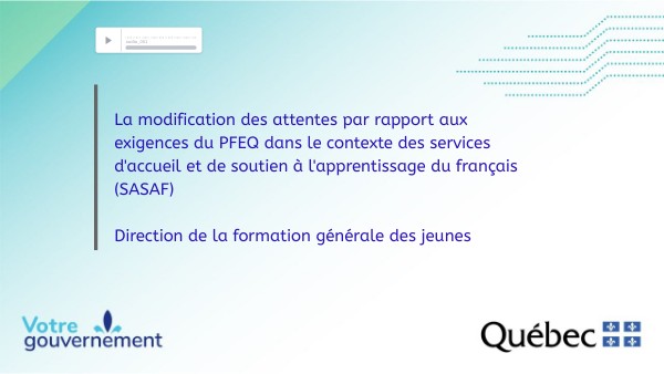 La modification des attentes par rapport aux exigences du PFEQ dans le contexte des services d'accueil et de soutien à l'apprentissage du français (SASAF) Direction de la formation générale des jeunes