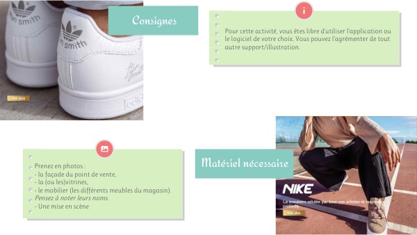 Prenez en photos : - la façade du point de vente, - la (ou les)vitrines, - le mobilier (les différents meubles du magasin). Pensez à noter leurs noms. - Une mise en scène