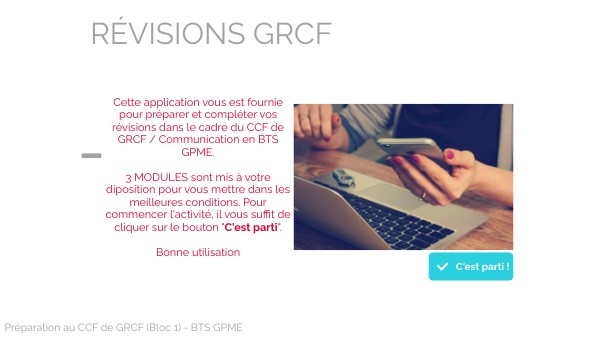 Cette application vous est fournie pour préparer et compléter vos révisions dans le cadre du CCF de GRCF / Communication en BTS GPME.3 MODULES sont mis à votre diposition pour vous mettre dans les meilleures conditions. Pour commencer l'activité, il vous suffit de cliquer sur le bouton "C'est parti". Bonne utilisation