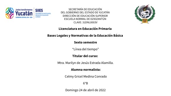 Licenciatura en Educación Primaria Bases Legales y Normativas de la Educación Básica Sexto semestre “Línea del tiempo” Titular del curso: Mtra. Marilyn de Jesús Estrada Alamilla. Alumna normalista: Celmy Gricel Medina Conrado 6°B Domingo 24 de abril de 2022