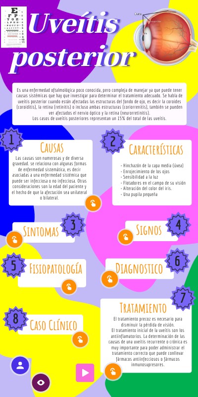 Es una enfermedad oftalmológica poco conocida, pero compleja de manejar ya que puede tener causas sistémicas que hay que investigar para determinar el tratamiento adecuado. Se habla de uveítis posterior cuando están afectadas las estructuras del fondo de ojo, es decir la coroides (coroiditis), la retina (retinitis) o incluso ambas estructuras (coriorrenitis), también se pueden ver afectados el nervio óptico y la retina (neurorretinitis). Los casos de uveítis posteriores representan un 15% del total de las uveítis.