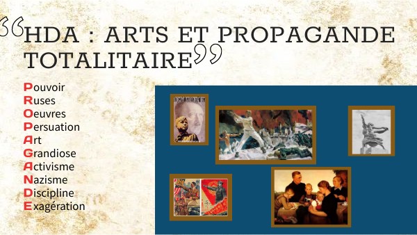 Diapo 1 ( partant d'en haut à gauche ) :- " La jeunesse sert le Führer. Adolescents, rejoignez les Jeunesses hitlériennes." ( 1935 ) - "Défense de Sébastopol" (1942) - « L’ouvrier et la Kolkhozienne » ( 1937 ) - Duel de deux affiches de propagande ( 1934 ) - « La famille de paysans de Kahlenberg » ( 1939 ) Diapo 5 : -Affiche du film "Octobre" (1927) -Affiche du film "Le juif éternel" ( 1940 ) Diapo 6 : - Photographie du pavillon soviétique ( 1937 ) - Carte postale montrant le pavillon nazi ( 1937 )