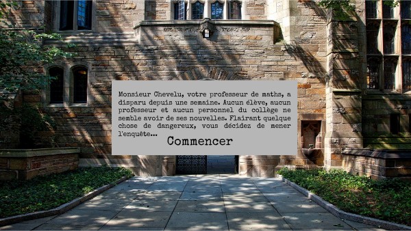 Monsieur Chevelu, votre professeur de maths, a disparu depuis une semaine. Aucun élève, aucun professeur et aucun personnel du collège ne semble avoir de ses nouvelles. Flairant quelque chose de dangereux, vous décidez de mener l'enquête...