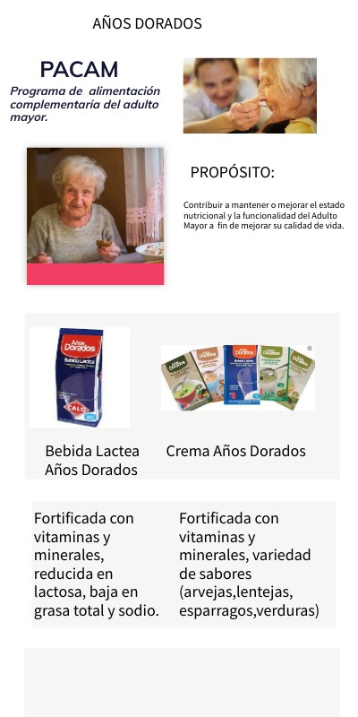 Este programa es un componente integral del Programa de Salud del Adulto Mayor (Examen de Medicina Preventiva del Adulto Mayor) y se vincula así a otras actividades de medicina preventiva y curativa, como la promoción del envejecimiento saludable, mantenimiento, y mejoramiento de la funcionalidad física y psíquica. Los productos entregados son la Crema Años Dorados y la Bebida Láctea Años Dorados.