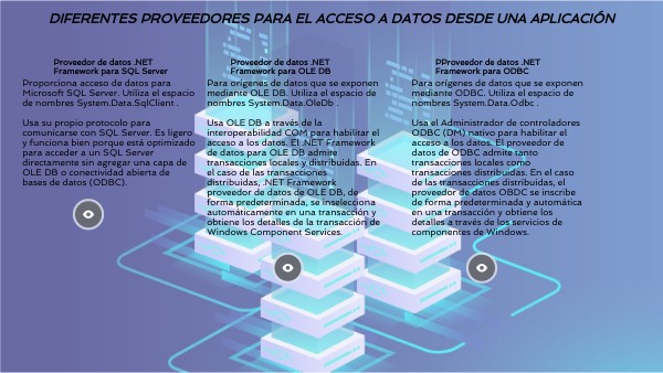 Para orígenes de datos que se exponen mediante OLE DB. Utiliza el espacio de nombres System.Data.OleDb . Usa OLE DB a través de la interoperabilidad COM para habilitar el acceso a los datos. El .NET Framework de datos para OLE DB admite transacciones locales y distribuidas. En el caso de las transacciones distribuidas, .NET Framework proveedor de datos de OLE DB, de forma predeterminada, se inselecciona automáticamente en una transacción y obtiene los detalles de la transacción de Windows Component Services.