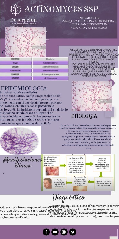 E.La actinomicosis se sospecha clínicamente y se confirma por la identificación de A. israelii u otras especies de Actinomyces mediante microscopia y cultivo del esputo (idealmente obtenido por endoscopia), pus o una biopsia.