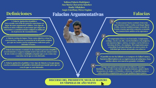 Conclusión: Se pudo determinar la cantidad de falacias que el presidente de Venezuela implementada para persuadir a los ciudadanos a su favor a la hora de votaciónes presidenciales, con argumentos vacíos y sin validez.