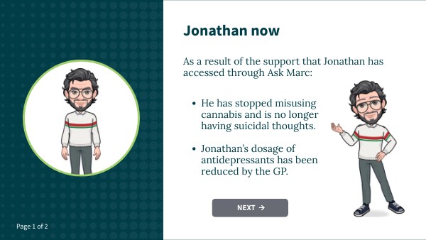 - He has stopped misusing cannabis and is no longer having suicidal thoughts.