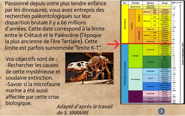 Passionné depuis votre plus tendre enfance par les dinosaures, vous avez entrepris des recherches paléontologiques sur leur disparition brutale il y a 66 millions d'années. Cette date correspond à la limite entre le Crétacé et le Paléocène (l'époque la plus ancienne de l'ère Tertiaire). Cette limite est parfois surnommée "limite K-T".