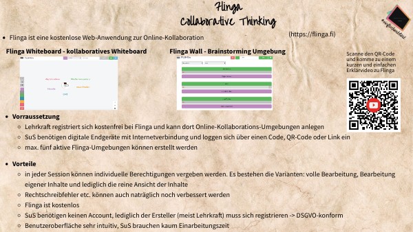 - Lehrkraft registriert sich kostenfrei bei Flinga und kann dort Online-Kollaborations-Umgebungen anlegen