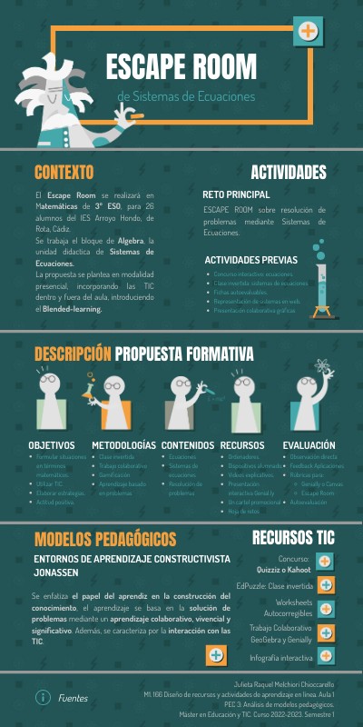 El Escape Room se realizará en Matemáticas de 3º ESO, para 26 alumnos del IES Arroyo Hondo, de Rota, Cádiz. Se trabaja el bloque de Algebra, la unidad didactica de Sistemas de Ecuaciones. La propuesta se plantea en modalidad presencial, incorporando las TIC dentro y fuera del aula, introduciendo el Blended-learning.