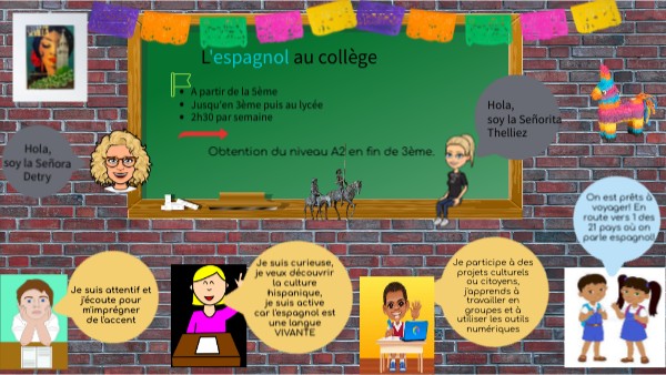 - Citoyens: lutte contre le harcèlement, projets associatifs Artisitiques (Abécédaires),écriture de lettres de motivation, exposition à venir au CDI et à la bibliothèque... - Ludiques: enquêtes, cluedo, jeu de dés, énigmes, concours multiples en lien avec le CDI, défis de prononciation, escape game, mises en scènes théatrâles... - Culturels: voyage, flamenco, concert, visites de musée, échange virtuel avec un collège de Castille, accueil d'un assistant du Salvador 4 heures par semaine, lecture d'un roman en espagnol
