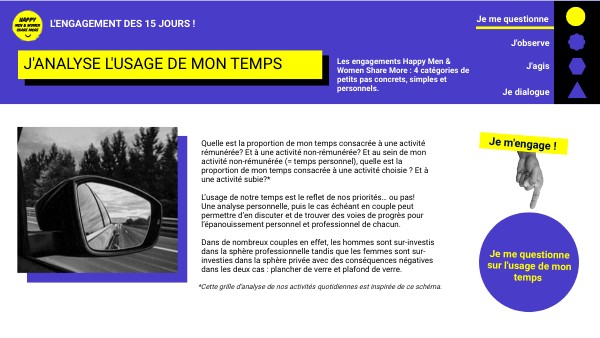Les engagements Happy Men & Women Share More : 4 catégories de petits pas concrets, simples et personnels.