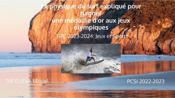 Chaque été, je pratique du surf dans mon spot habituel, la plage de Berria, sur les côtes de la Cantabrie, au Nord de l’Espagne. Malgré d’énormes progrès depuis le début, je n’arrive toujours pas à trouver les techniques idéales afin de rester en équilibre très longtemps sur ma planche, tandis que d’autres arrivent à tenir en équilibre davantage, même quand la vague se rapetisse ! Ce TIPE a pour but de trouver la meilleure technique de stabilité au surf à l’aide de lois élementaires de la mécanique, en respectant les règles de la compétition.