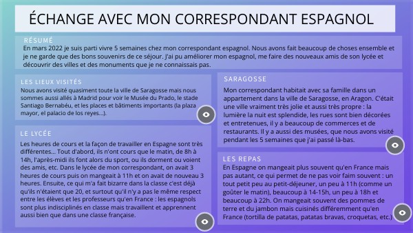 En mars 2022 je suis parti vivre 5 semaines chez mon correspondant espagnol. Nous avons fait beaucoup de choses ensemble et je ne garde que des bons souvenirs de ce séjour. J'ai pu améliorer mon espagnol, me faire des nouveaux amis de son lycée et découvrir des villes et des monuments que je ne connaissais pas.