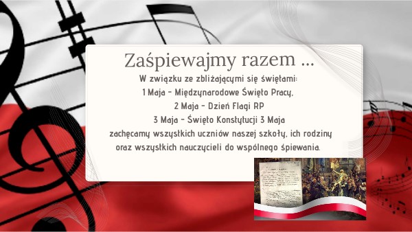 W związku ze zbliżającymi się świętami: 1 Maja - Międzynarodowe Święto Pracy, 2 Maja - Dzień Flagi RP 3 Maja - Święto Konstytucji 3 Maja zachęcamy wszystkich uczniów naszej szkoły, ich rodziny oraz wszystkich nauczycieli do wspólnego śpiewania.