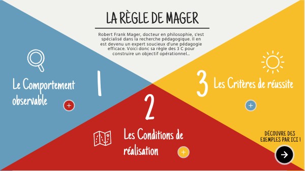 Robert Frank Mager, docteur en philosophie, s'est spécialisé dans la recherche pédagogique. Il en est devenu un expert soucieux d'une pédagogie efficace. Voici donc sa règle des 3 C pour construire un objectif opérationnel...