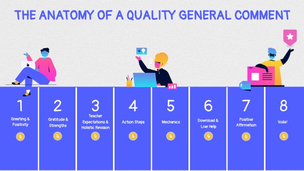 Be mindful of the students grade level when writing your general comment. Utilize age appropriate vocabulary and concepts.