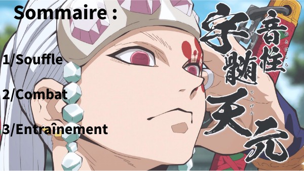 Le souffle du son est un dérivé du souffle de la foudre. Le souffle du son utilise une stratégie de combat propre à ce souffle "Score" consistant à analyser et décortiquer les mouvements de son adversaire en analysant le rythme de leur mouvement pour pouvoir trouver l'ouverture et l'exploiter. Les utilisateurs du souffle du son utilisent des doubles lames reliées avec une chaîne, ils se servent aussi de bombes anti-démon créé avec une poudre à canon spéciale. Il n'utilise pas que des bombes explosives, mais aussi des bombes fumigènes. Le souffle du son a été inventé par un Shinobi (Ninja) voilà pourquoi nous utilisons des objets propres au Ninja.