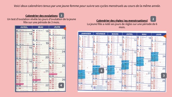Voici deux calendriers tenus par une jeune femme pour suivre ses cycles menstruels au cours de la même année.