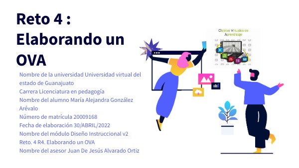 Nombre de la universidad Universidad virtual del estado de Guanajuato Carrera Licenciatura en pedagogía Nombre del alumno María Alejandra González Arévalo Número de matrícula 20009168 Fecha de elaboración 30/ABRIL/2022 Nombre del módulo Diseño Instruccional v2 Reto. 4 R4. Elaborando un OVA Nombre del asesor Juan De Jesús Alvarado Ortiz