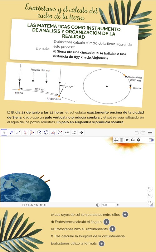 c) Los rayos de sol son paralelos entre ellos d) Eratóstenes calculó el ángulo e) Eratóstenes hizo el razonamiento f) Tras calcular la longitud de la circunferencia, Eratóstenes utilizó la fórmula