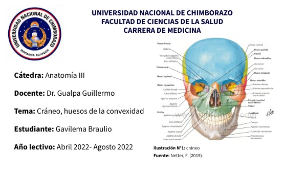 Cátedra: Anatomía III Docente: Dr. Gualpa Guillermo Tema: Cráneo, huesos de la convexidad Estudiante: Gavilema Braulio Año lectivo: Abril 2022- Agosto 2022