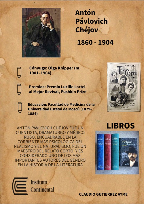 Antón Pávlovich Chéjov fue un cuentista, dramaturgo y médico ruso. Encuadrable en la corriente más psicológica del realismo y el naturalismo, fue un maestro del relato corto, y es considerado uno de los más importantes autores del género en la historia de la literatura