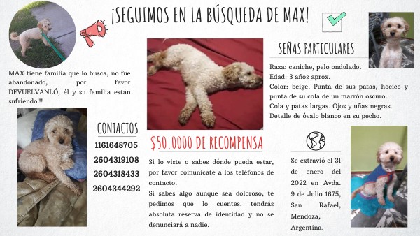 MAX tiene familia que lo busca, no fue abandonado, por favor DEVUELVANLÓ, él y su familia están sufriendo!!!