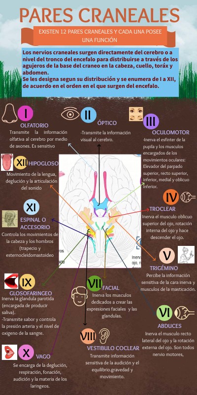 Los nervios craneales surgen directamente del cerebro o a nivel del tronco del encefalo para distribuirse a través de los agujeros de la base del craneo en la cabeza, cuello, toráx y abdomen. Se les designa segun su distribución y se enumera de I a XII, de acuerdo en el orden en el que surgen del encefalo.