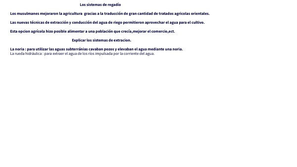 Los sistemas de regadíoLos musulmanes mejoraron la agricultura gracias a la traducción de gran cantidad de tratados agricolas orientales. Las nuevas técnicas de extracción y conducción del agua de riego permitieron aprovechar el agua para el cultivo. Esta opcion agrícola hizo posible alimentar a una población que crecía,mejorar el comercio,ect. Explicar los sistemas de extracion. La noria : para utilizar las aguas subterránias cavaban pozos y elevaban el agua mediante una noria. La rueda hidráulica : para extraer el agua de los ríos impulsada por la corriente del agua.