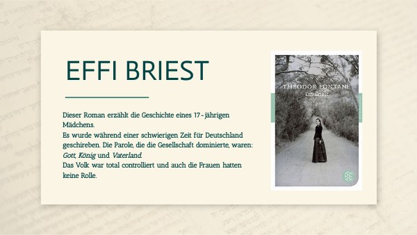 - Die Rolle der Frau in diesem Roman ist null. Denn Effi hat keine Macht. Z.B. Als Instetten die Briefe zwischen Effi und Crampas entdeckt, schreibt er ihren Eltern. - Instetten gibt Effi keine Gelegenheit, sich ihre Position zu erklären. - Am Ende des Romans findet ein Duell zwischen Crampas und Instetten, ein Mann von starken Prinzipien. Instetten hat für seinen Ruf gehandelt, und hat sich als Opfter verhalten. In Wahrheit war das wahre Opfer Effi, die immer allein gelassen wurde.