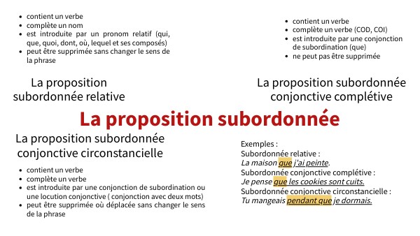 Exemples : Subordonnée relative : La maison que j'ai peinte. Subordonnée conjonctive complétive : Je pense que les cookies sont cuits. Subordonnée conjonctive circonstancielle : Tu mangeais pendant que je dormais.