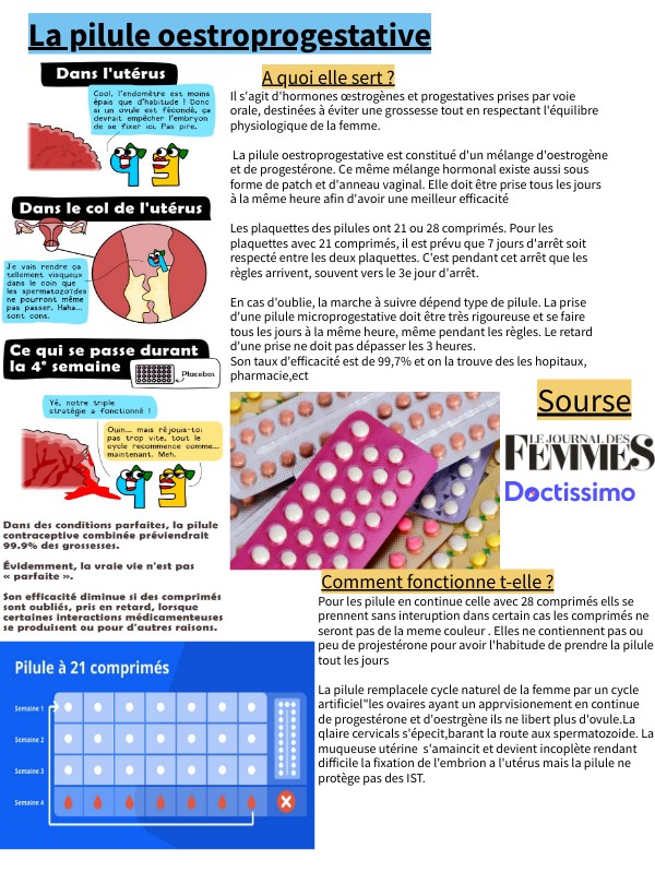 Il s'agit d'hormones œstrogènes et progestatives prises par voie orale, destinées à éviter une grossesse tout en respectant l'équilibre physiologique de la femme. La pilule oestroprogestative est constitué d'un mélange d'oestrogène et de progestérone. Ce même mélange hormonal existe aussi sous forme de patch et d'anneau vaginal. Elle doit être prise tous les jours à la même heure afin d'avoir une meilleur efficacité Les plaquettes des pilules ont 21 ou 28 comprimés. Pour les plaquettes avec 21 comprimés, il est prévu que 7 jours d'arrêt soit respecté entre les deux plaquettes. C'est pendant cet arrêt que les règles arrivent, souvent vers le 3e jour d'arrêt. En cas d'oublie, la marche à suivre dépend type de pilule. La prise d'une pilule microprogestative doit être très rigoureuse et se faire tous les jours à la même heure, même pendant les règles. Le retard d'une prise ne doit pas dépasser les 3 heures. Son taux d'efficacité est de 99,7% et on la trouve des les hopitaux, pharmacie,ect