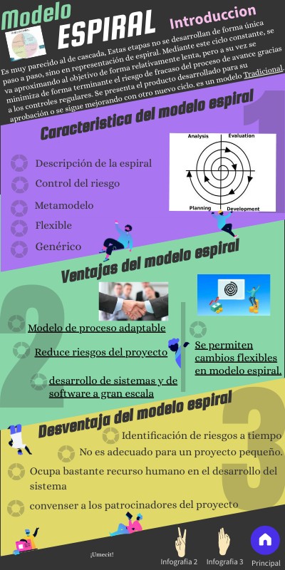 Es muy parecido al de cascada, Estas etapas no se desarrollan de forma única paso a paso, sino en representación de espiral. Mediante este ciclo constante, se va aproximando al objetivo de forma relativamente lenta, pero a su vez se minimiza de forma terminante el riesgo de fracaso del proceso de avance gracias a los controles regulares. Se presenta el producto desarrollado para su aprobación o se sigue mejorando con otro nuevo ciclo. es un modelo Tradicional.