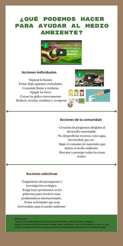 Referencias https://www.arboleda.mx/2019/04/24/actividades-reducir-huella-ecologica/ https://eacnur.org/blog/acciones-cuidar-medio-ambiente-casa-tc_alt45664n_o_pstn_o_pst/ https://portalacademico.cch.unam.mx/alumno/biologia2/unidad2/desarrolloSustentable