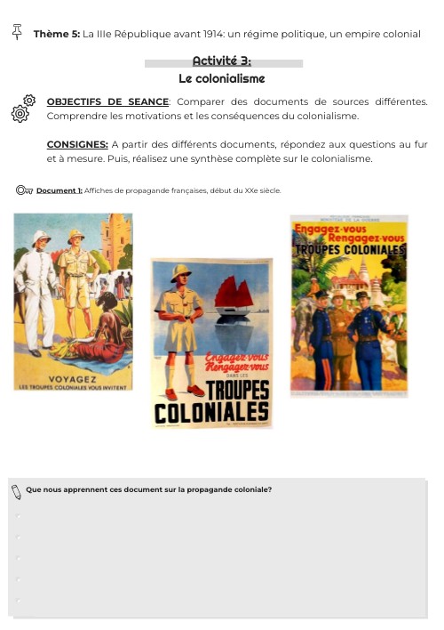 OBJECTIFS DE SEANCE: Comparer des documents de sources différentes. Comprendre les motivations et les conséquences du colonialisme. CONSIGNES: A partir des différents documents, répondez aux questions au fur et à mesure. Puis, réalisez une synthèse complète sur le colonialisme.