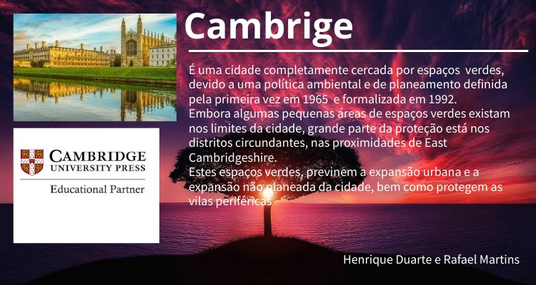 É uma cidade completamente cercada por espaços verdes, devido a uma política ambiental e de planeamento definida pela primeira vez em 1965 e formalizada em 1992. Embora algumas pequenas áreas de espaços verdes existam nos limites da cidade, grande parte da proteção está nos distritos circundantes, nas proximidades de East Cambridgeshire. Estes espaços verdes, previnem a expansão urbana e a expansão não planeada da cidade, bem como protegem as vilas periféricas Henrique Duarte e Rafael Martins
