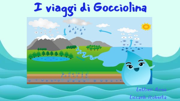 Una mattina alla fine di agosto seguendo altre gocce su un’onda spumeggiante, Gocciolina finisce dritta, dritta nel secchiello di un bambino che la porta sulla spiaggia e sta per rovesciarla sul suo castello di sabbia, quando sente una voce: “Ma tu lo sai chi sono io?” La nostra goccia si è messa vicina a una conchiglia e parla come un uomo con l’altoparlante: “Io sono una piccolissima parte di tutta l’acqua che vedi, caro bambino, e in pochi giorni ho fatto tanti viaggi e giri che tu non puoi neanche immaginare e poi mi hanno raccontato le gocce grandi che ne farò tantissimi altri: tu mi potrai trovare nel tuo lavandino quando ti lavi i denti oppure nel bicchiere dell’acqua da bere e perfino nei tuoi occhi quando piangi! Allora, sono importante o no amico mio? Trattami bene e io ti sarò molto, ma molto utile”.