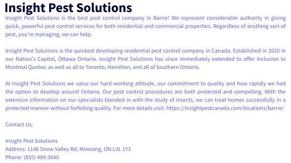 Insight Pest Solutions is the best pest control company in Barrie! We represent considerable authority in giving quick, powerful pest control services for both residential and commercial properties. Regardless of anything sort of pest, you're managing, we can help. Insight Pest Solutions is the quickest developing residential pest control company in Canada. Established in 2020 in our Nation's Capital, Ottawa Ontario. Insight Pest Solutions has since immediately extended to offer inclusion to Montreal Quebec as well as all to Toronto, Hamilton, and all of Southern Ontario. At Insight Pest Solutions we value our hard-working attitude, our commitment to quality and how rapidly we had the option to develop around Ontario. Our pest control procedures are both protected and compelling. With the extensive information on our specialists blended in with the study of insects, we can treat homes successfully in a protected manner without forfeiting quality. For more details visit: https://insightpestcanada.com/locations/barrie/ Contact Us: Insight Pest Solutions Address: 1148 Snow Valley Rd, Minesing, ON L0L 1Y3 Phone: (855) 489-3640