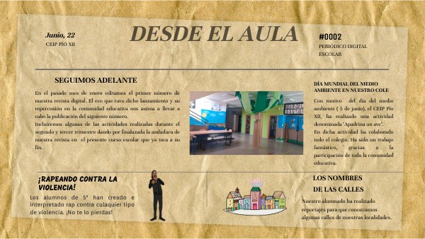 En el pasado mes de enero editamos el primer número de nuestra revista digital. El eco que tuvo dicho lanzamiento y su repercusión en la comunidad educativa nos anima a llevar a cabo la publicación del siguiente número. Incluiremos algunas de las actividades realizadas durante el segundo y tercer trimestre dando por finalazada la andadura de nuestra revista en el presente curso escolar que ya toca a su fin.
